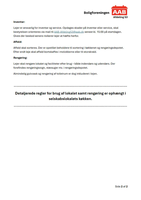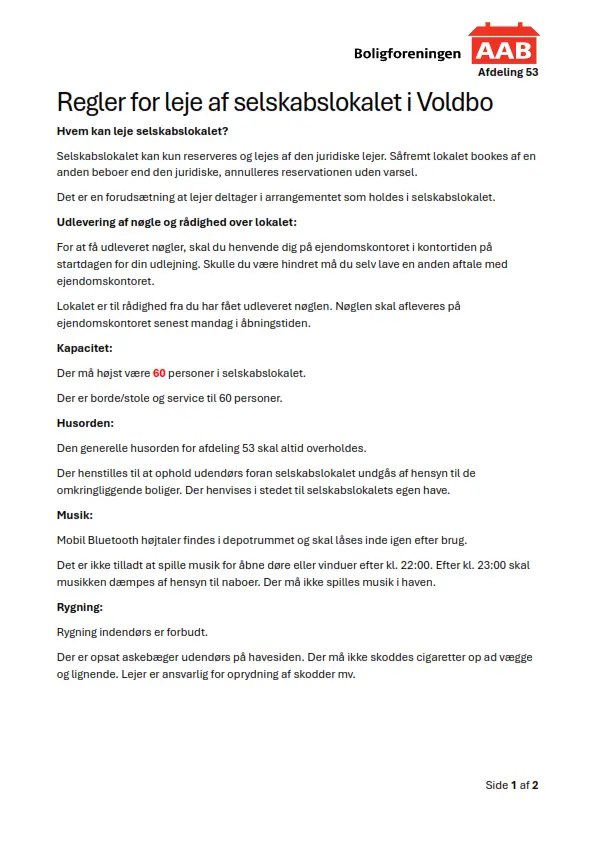 Selskabslokalet kan kun lejes af den juridiske lejer i afdeling 53. Lejer skal selv deltage i arrangementet.
